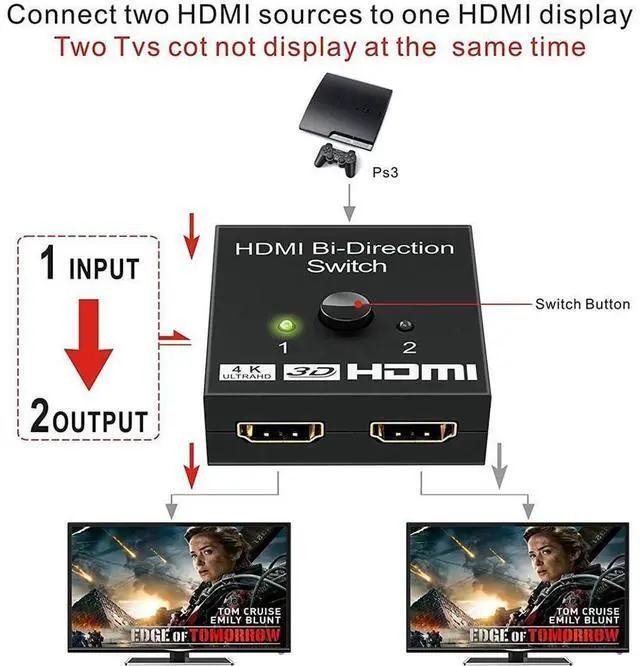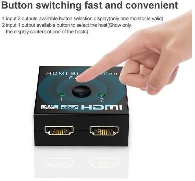 By pressing the button, you can select one of two HDMI source devices (e. g. Computer, Xbox One, PS3) to play on 1 HDMI projector or HDTV,