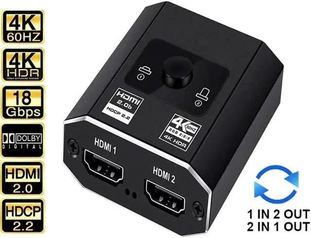 Ultra Slim & Easy to use: Plug and play and no additional power supply is required. This HDMI Splitter has a slim size. It is conducive to neat cable placement and has superb heat dissipation. After connecting the device with HDMI cables, press the button on this 4K HDMI selector to switch the signal between 2 input or output ports.