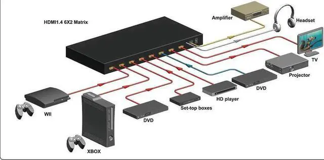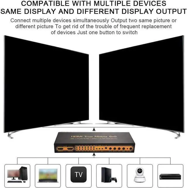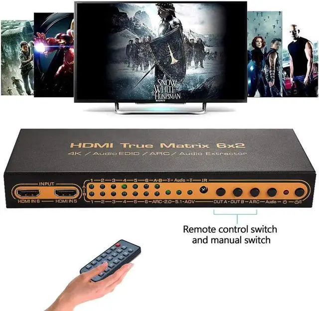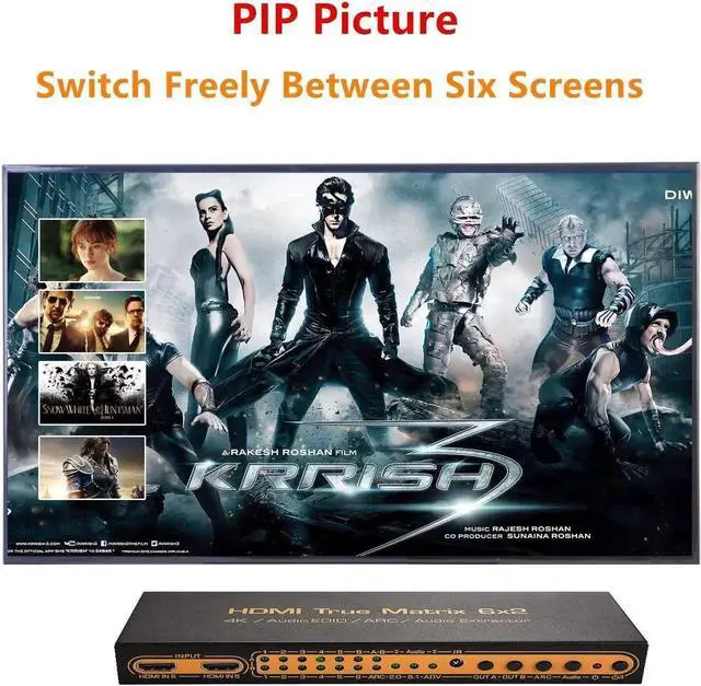 The 6x2 HDMI Matrix supports the feature of PIP, ARC, 4K and 3D, which can switch or splitter the six HD input sources to the two HD Displays. It also can do the audio extract by the Optical port or HP port. ARC feature can let you return your TV audio to the av receiver; the PIP feature can let you choose the input sources channel by watch the small picture window at the Display.
