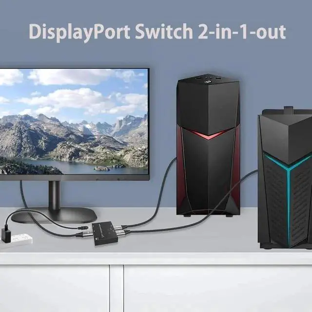 DP to 2 DP Bi-direction high speed 32.4Gbps 8K 4K DisplayPort Switch 1.4 Key features: Bi-direction DP Switch: The DisplayPort switcher allow you to connect two DP source to one DP display or connect one DisplayPort source to toggle between two displays.(IMPORTANT NOTE: Two displays CANNOT display simultaneously) 8K DP 1.4 Splitter: Support 8K 30Hz, 4K 120Hz, 1080P 240Hz resolution, provide you with transfer rates up to 32.4Gbps and backward compatible with all previous DP standards.(You need connect standard DP 1.4 cable to enjoy visual effects) Plug and Play: External power required, the DP selector box is easy to setup and operate. Simply press the button to swap signal within one second and the indicator lights show the working status. Two Modes Mode one One PC connects two displays Note: 2 displays can not be displayed at the same time Mode two(Switch) Two PC connects to a single display Note: 1.Switch one PC, display shows one PC content; 2.Switch other PC, display shows the other PC content 3.One PC is 8K and the other is 4K, then the display is only 4K, means the display depends on the lower one.