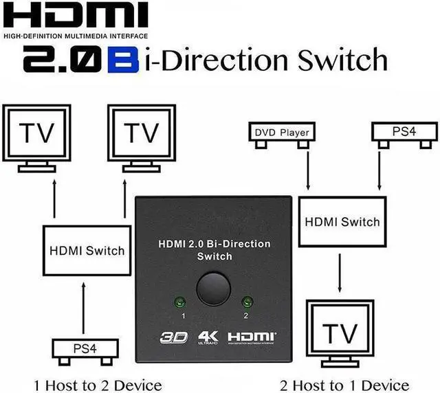 • 2 Input 1 Output or 1 Input 2 Output-HDMI Switch with Bi-Directional function and HDCP Passthrough allows you to connect two high-definition HDMI sources like Blu-ray or PS4 to a single HDMI display. It also allows you to output single high-definition source to two displays.