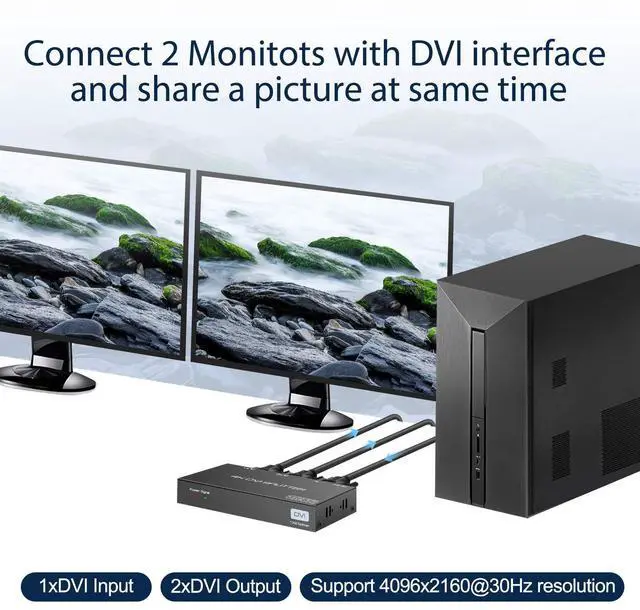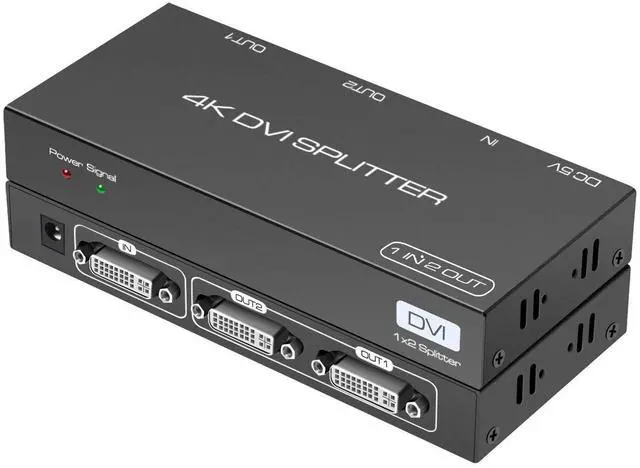 The DVI 1 in 2 out splitter can transmit one DVI signal to two DVI monitors at the same time.