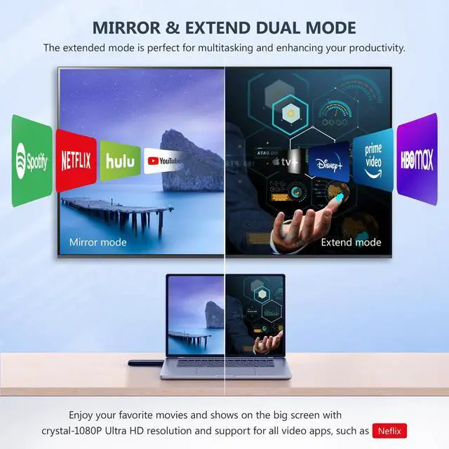 - Plug & Play: Simply plug the transmitter (TX) and receiver (RX) into HDMI-enabled devices and start casting without the need for Wi-Fi, Bluetooth, or drivers.
