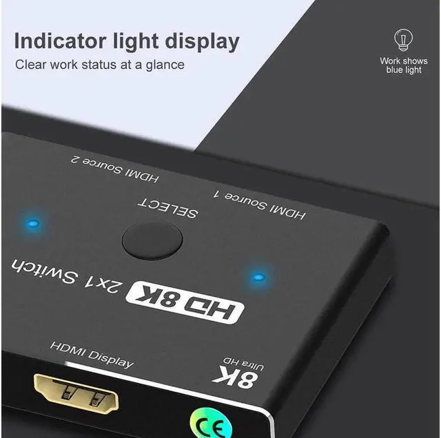 HDMI Multiple Switch: By using this HDMI 8K Switch you can press"select"button to switch between your two HDMI Source Devices switching between entertainment and office It can facilitate your life. Please connect according to the text logo on the switcher. If the screen cannot be displayed normally please try to supply power to the switcher. You cannot make the connection between "one signal input device and two monitors"Widely used in many occasions: Our HDMI 8K switcher/splitter is easy to use and can be widely used in Studying Entertainment Work and other Occasions ultra-High-Definition Smooth Video and Picture Quality Experience Multi-source Switching providing multiple possibilities for work and entertainment. Especially for connecting with latest PS5 and Xbox you can achieve Ultra HD and Smooth gaming experienceManual switching Non-automatic switching. Lightweight and portable design 18 Month Worry-free Warranty Lifetime Technical Support 24 hr dedicated email customer support