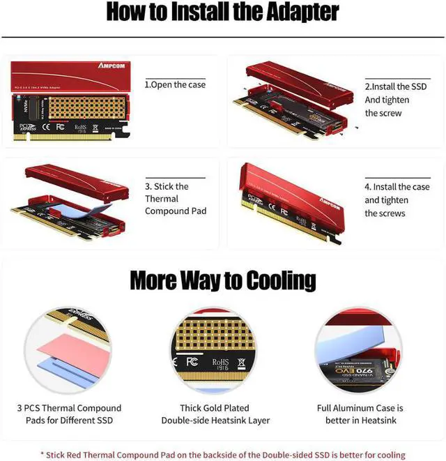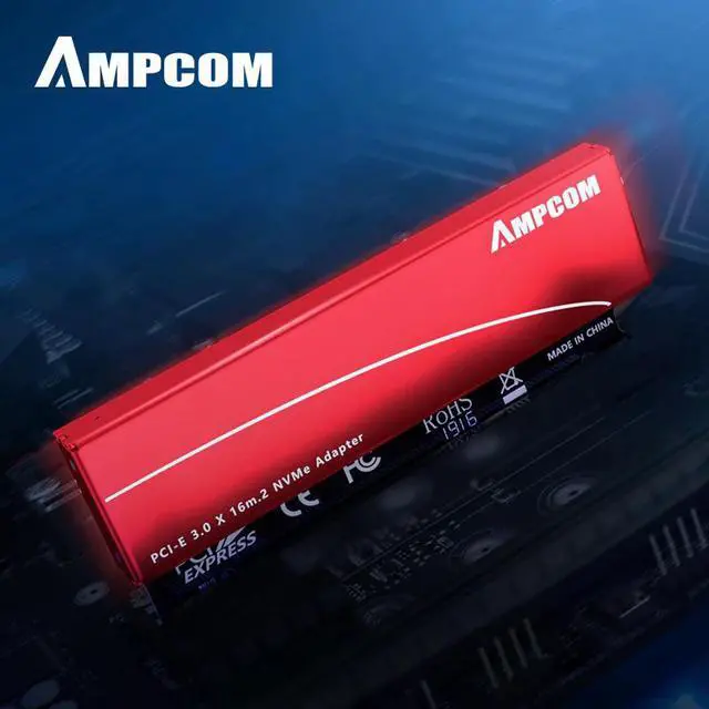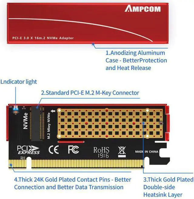 Fast Heat Dissipation extension card with vented design on immersion gold PCB enhances heat dissipation of SSD, Full-Al case help reduce or eliminate EMI/RFI noise, and X16 PCIe slot design is more stable fos installation.