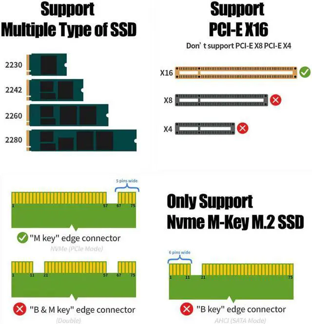 Supports PCIe Gen3 and PCIe Gen2 M.2 NGFF 80mm, 60mm, 42mm,30mm SSD.