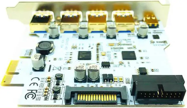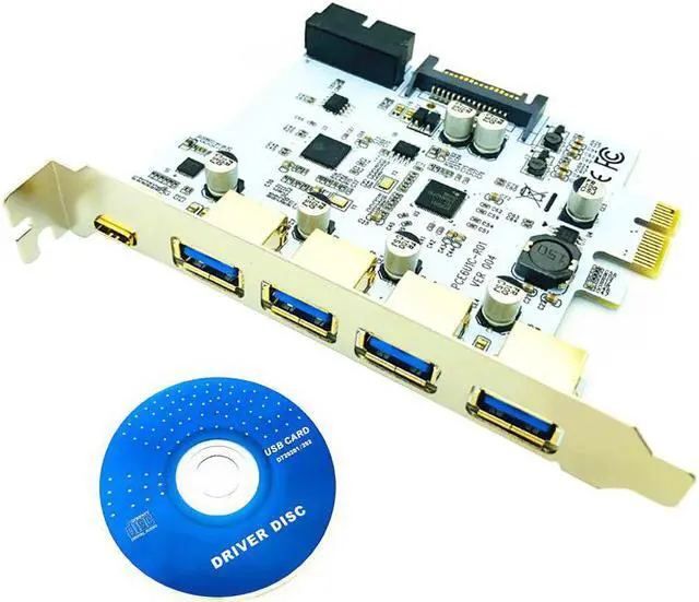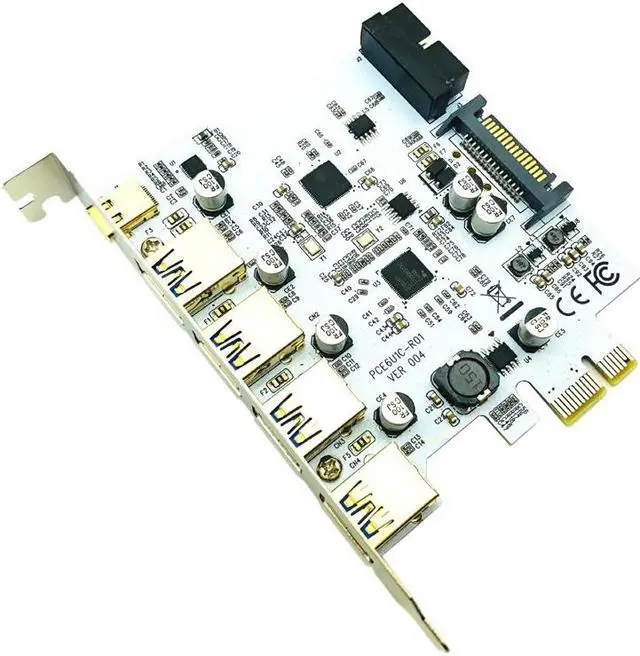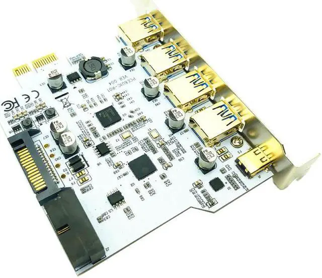 Features:1. Reversible -C/Type-C connector design (plugs in both ways) allows you to conveniently connect cable in any orientation2. Supports up to 7 3.0 devices: 1 C + 4 A 5 port hub and 1 internal 20pin connector for expanding another two 3.0 port.3. 4 external 3.0 Type-C female connectors..4. Supports simultaneous operation of multiple 3.0/2.0/1.1 devices.5. One motherboard 20P male connector available for 2 more 3.0 port.6. SATA power connector available for some high current consumption peripherals or 3 above devices at the same time.7. Premium material and workmanship, high quality and long lifespan. Specification:Material: PCBColor: WhiteMain Chips: RENSAS D720201 + GL35XXInterface: 3.1 TYPE-C + 4 Port 3.0 TYPE-A + 19PIN HeaderSupport System: Compatible with for Windows XP, for Vista, for Windows 7, for Linux, for Windows 8/8.1/10Size: 12 * 8.2 * 1.8cm/4.7 * 3.2 * 0.7inPackage Weight: Approx.90g/3.2oz Note: 1. Please allow 1-3cm error due to manual measurement. Thanks for your understanding.2. Monitors are not calibrated same, item color displayed in photos may be showing slightly different from the real object. Please take the real one as standard. You'll receive:1 x PCI-E to 3.0 Expansion Card1 x Driver CD Please check pictures for more details.