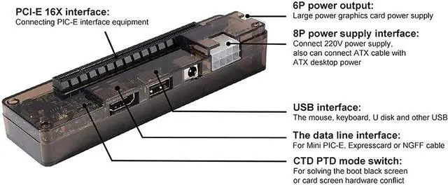 With 6pin interface for connecting video card po wer supply; 8pin interface for connecting EXP GDC po wer supply.