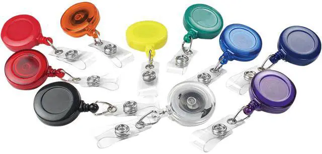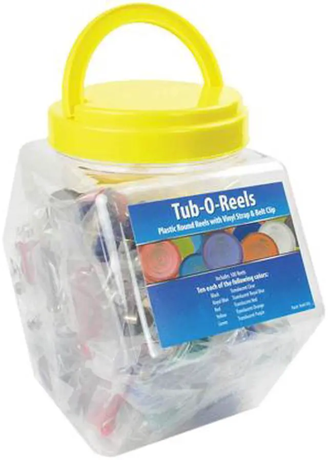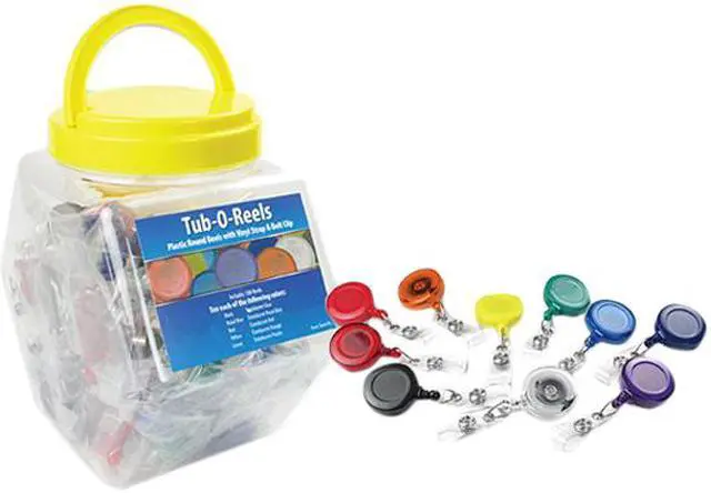 BRADY PEOPLE ID, TUB-0-REELS, PLASTIC ROUND REELS WITH CLEAR VINYL STRAP AND SLIDE TYPE BELT CLIP, 1 TUB CONTAINS 100 BADGE REELS IN BLACK, ROYAL BLUE, GREEN, ORANGE, YELLOW AND PURPLE