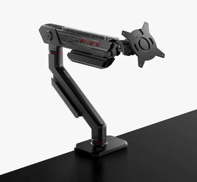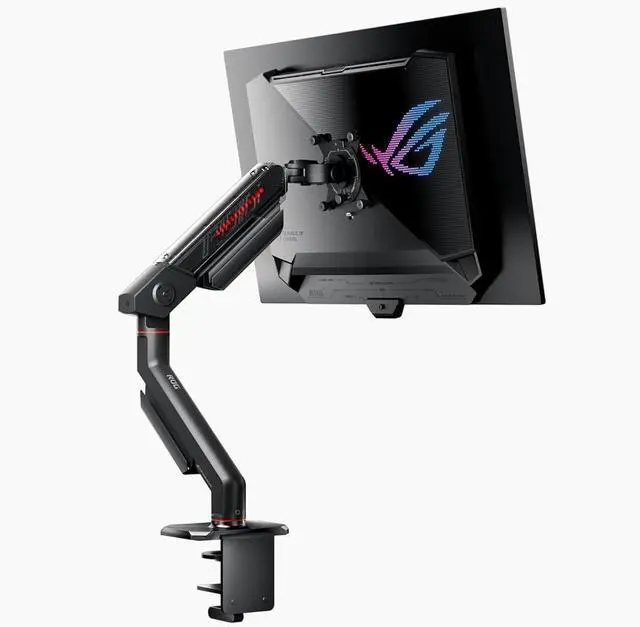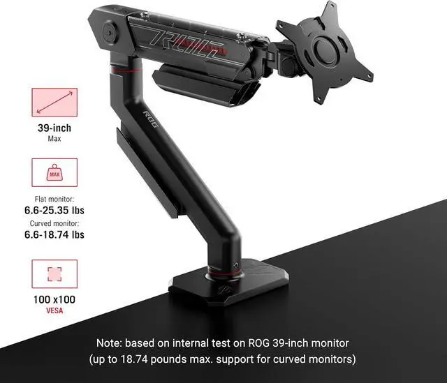 ROG Ergo Monitor Arm is designed for compatibility with a wide range of monitors. It can handle up to 39-inch monitors, supporting flat monitors with a maximum weight of 23.35 pounds (11.5 kg) or curved monitors weighing up to 18.74 pounds (8.5 kg). The mechanical spring system of the ROG Ergo Monitor Arm allows for smooth, effortless adjustments through a wide range of movements. Tilt, swivel, or pivot the monitor to the desired position.