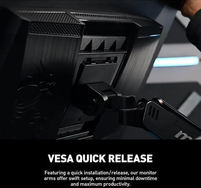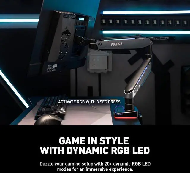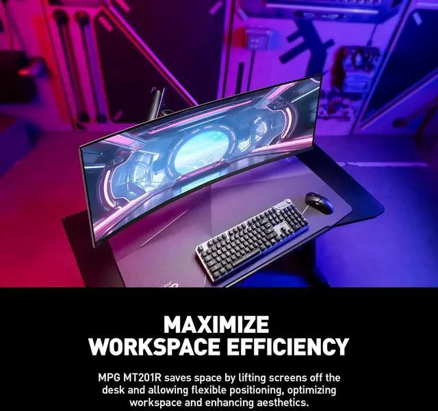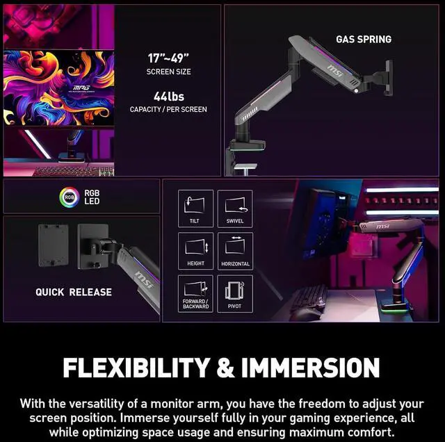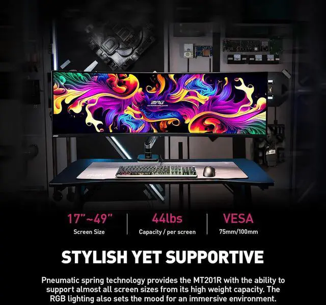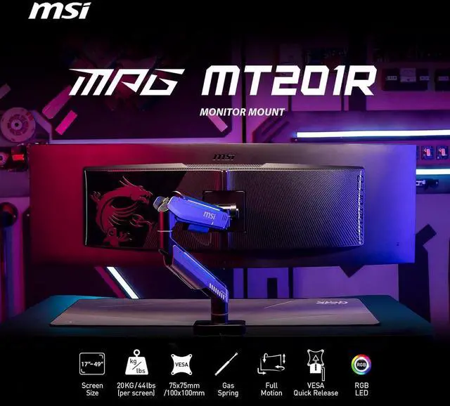 MSI MPG MT201R - Premium RGB Single Monitor Stand Arm, Supports 17-49" Screens and 44 lbs, VESA Compatible, Adjustable Heavy Duty Gas Spring Mount, Clamp & Grommet, Quick Release Plate - Gray