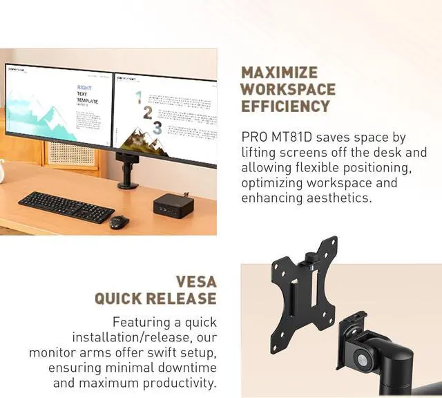 Easy Installation - Tool-free monitor arms for hassle-free installation or seamless grommet mounting.