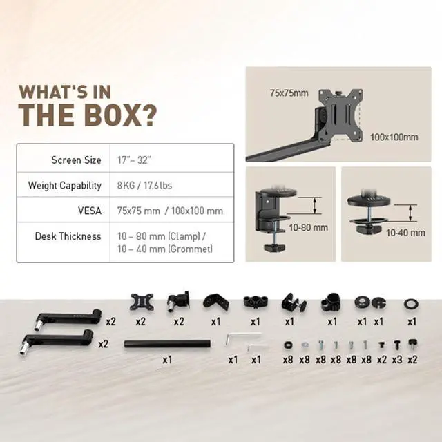 Weight Capacity - Offers maximum support for holding monitors up to 8KG / 17.6lbs (per monitor).