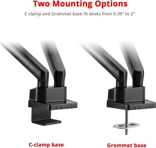 SIMPLE AND STURDY DESIGN: The included heavy-duty C-clamp is compatible with desk surfaces from 0.4" to 2" thick, and grommet mount fits through surface hole from 0.40" to 2.25" wide and up to 2.0" thick.