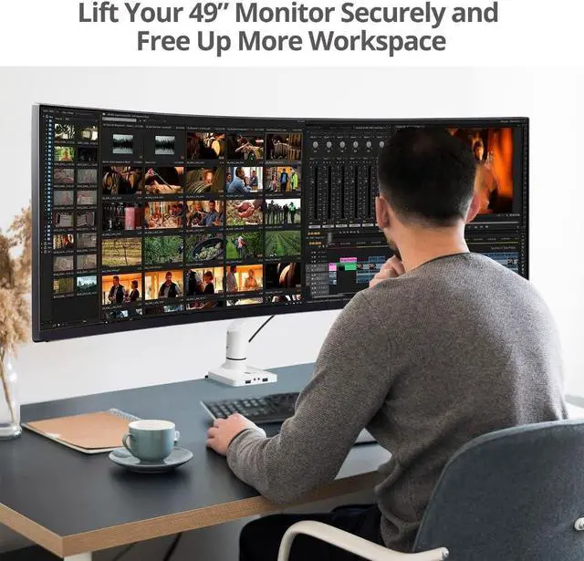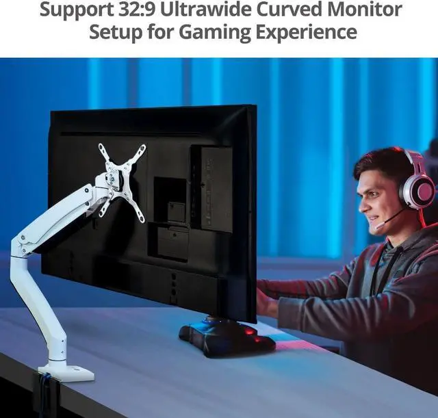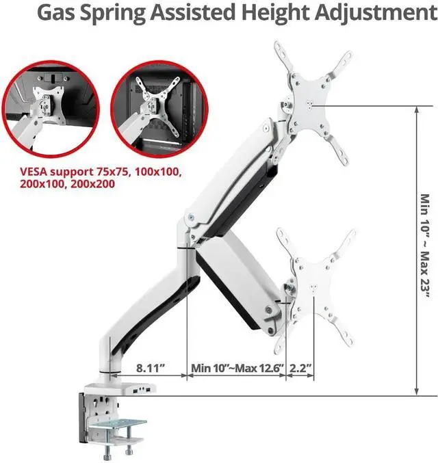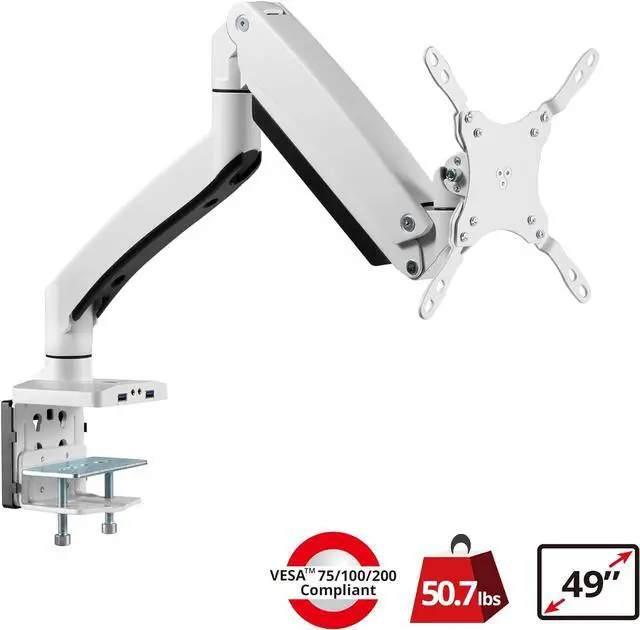Universal fit - Compatible with most 17" to 49" flat and curved monitors has 75 x 75, 100 x 100, 200 x 100 and 200 x 200 mm VESA mounting patterns, Arm supports up to 50.7 Ibs