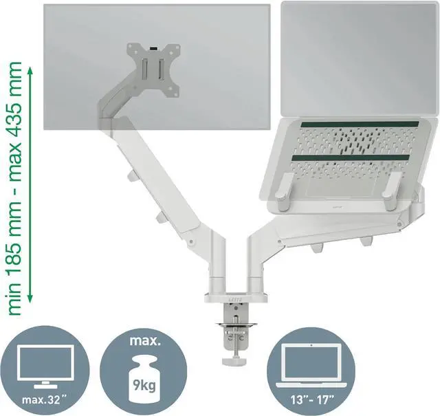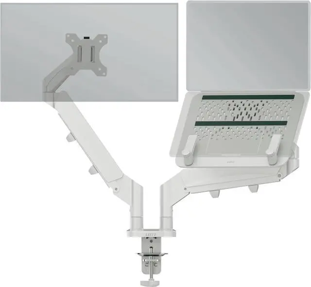Box contents: 1 x Leitz Ergo space-saving monitor mount with laptop holder, including mounting tool, light grey, 65380085