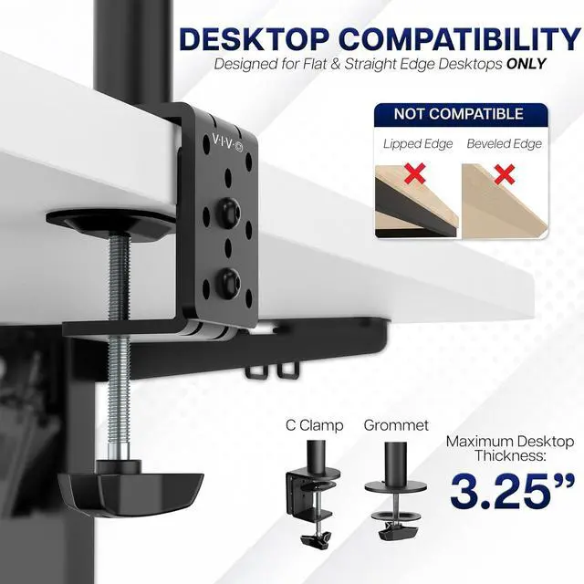 Heavy Duty C-clamp: Secures to the surface of your choice (up to 3.25" thick) with simple hand tightening, or use the equally sturdy grommet mount to suit your preferred layout. Please note: This mount is not compatible with beveled edged desktops