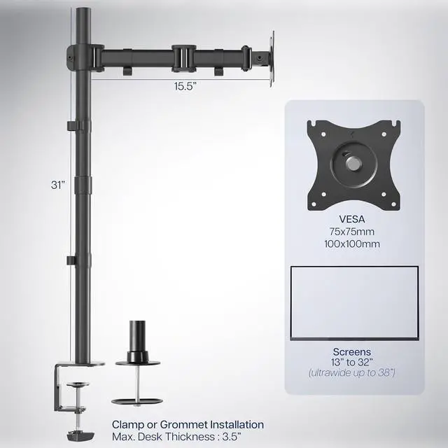 Enhance your visual display with Single Monitor Extra Tall Desk Mount (STAND-V001T) from VIVO! Clear up valuable workspace on your desk with this tall monitor stand. Constructed of high-grade steel, this rugged mount was built to resist scratches and support screens up to 22 lbs and 32 in size (Fits ultrawide monitors up to 38" if under 22 lbs). STAND-V001T offers a variety of features including an extra tall 31" center pole with easy height adjustment, articulation for your screen, and 5 adjustable joint points, all allowing you to create optimal viewing angles. Tighten or loosen each joint to make your mount as fluid or stationary as desired.