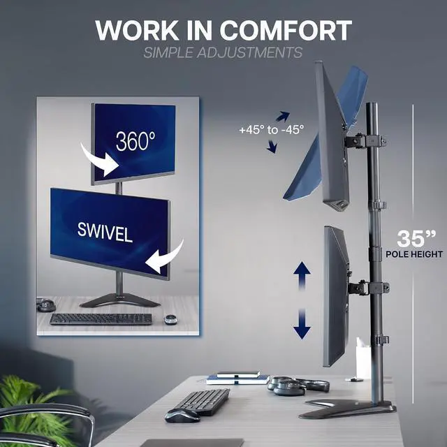 Available in Black or White . 1ARTICULATION2STURDY BASE3CABLE MANAGEMENT Stacked Dual Ultrawide Free Standing Mount Ergonomic Viewing WILL THIS FIT MY MONITOR?