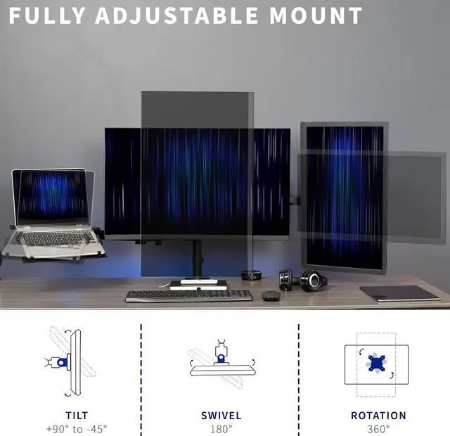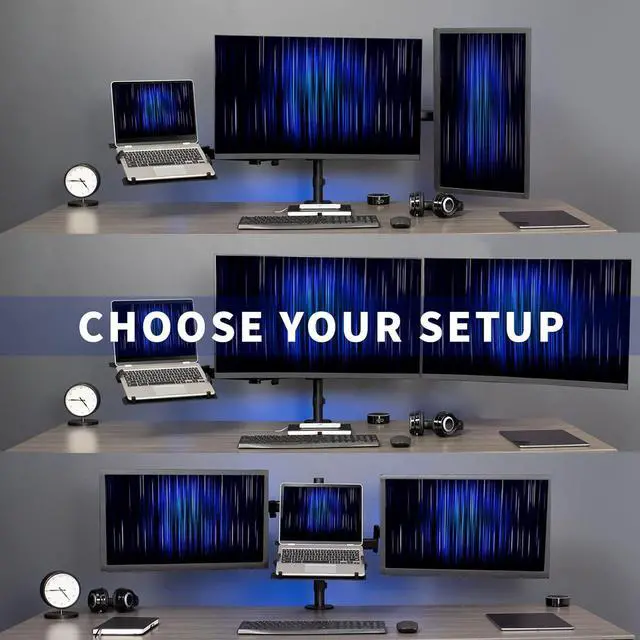 1CABLE MANAGEMENT2SMALL FOOTPRINT3ERGONOMIC VIEWING Screen SizesFits most 13 to 27 screensLaptop SizeFits laptops and notebooks 10 to 15.6 Number of Screens2 Computer Monitors + 1 LaptopVESA Pattern75x75mm & 100x100mmDesktop Thickness 0.4 to 3.2 for clamp, 0.4 to 1.6 for grommetWeight Capacity 15.4 lbs per armPole Height 17.5"T otal Arm Span55"Screen Articulation+90° to -45° tilt, 180° swivel, 360° rotationHeight AdjustmentProvided along the center poleMounting OptionsHeavy Duty C-Clamp or GrommetScreen OrientationPortrait or Landscape Dual Monitor + Single Laptop Mount SLEEK CABLE MANAGEMENT FREE UP DESK SPACE TILT, SWIVEL, & ROTATION Dual Left + Laptop Right SPECIFICATIONS & COMPATIBILITY
