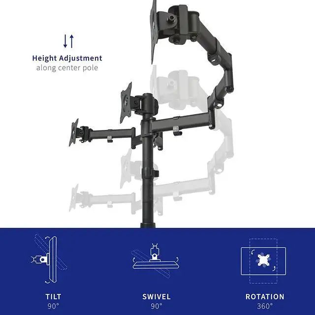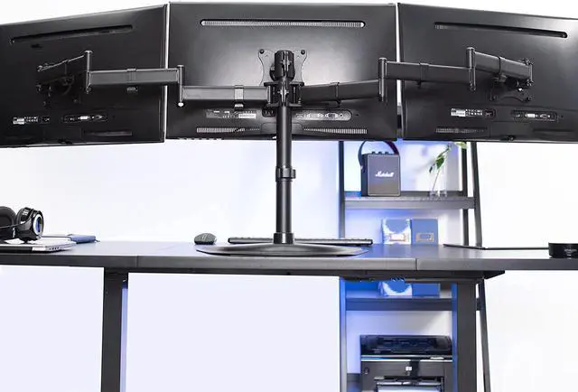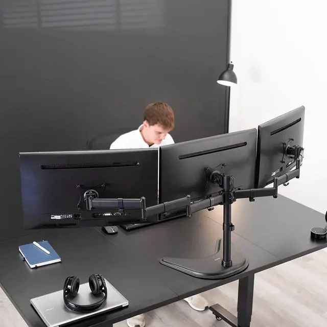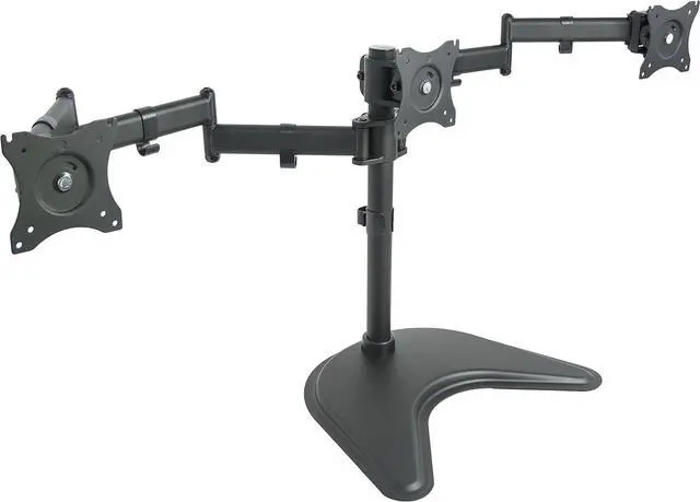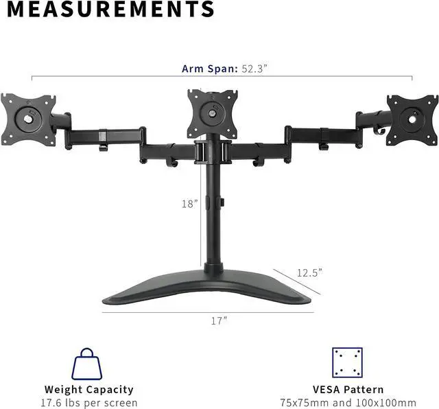 Brand new triple monitor stand (STAND-V003P) from VIVO! Clear up valuable work space on your desk with this heavy duty three monitor mount. Constructed of high-grade steel, this stand was built to resist scratches and supports three LCD screens up to 17.6 pounds and 24 in size each (this mount will fit 27" screens but will allow very limited angled screen positioning). STAND-V003P offers a variety of features including easy height adjustment, 45 degree tilting angles for your screens, and numerous adjustable joints. Tighten or loosen each joint to make your stand as fluid or stationary as desired. The VESA plates allows each individual plate to be adjusted up and down by 1.1 so your monitors will be perfectly aligned. This is a standard VESA mount with 75x75mm and 100x100mm mounting holes.