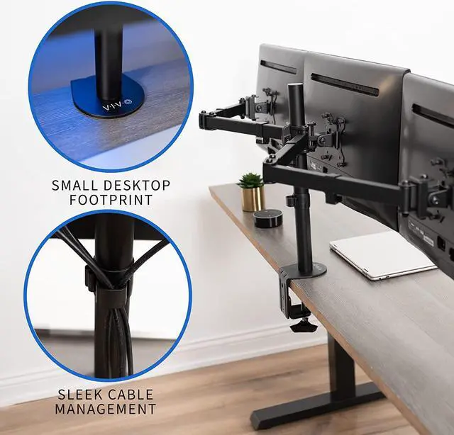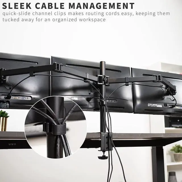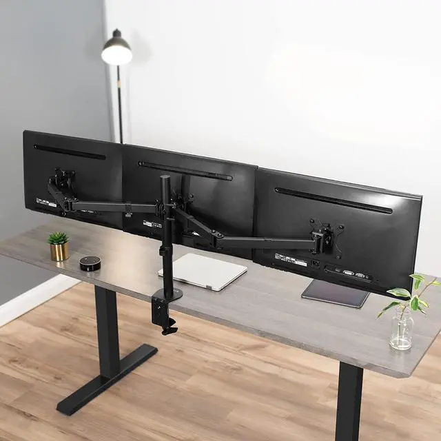 The triple monitor experience is great for the office multitasker and gamer alike. Adjust your screens to a more comfortable and ergonomic viewing position. With this stand's fluid articulation, finding the optimal angle for each display is easy. High-grade steel and aluminum construction along with the heavy duty C-clamp or optional grommet ensure your monitor will be kept secure. Mount is VESA compatible and supports the majority of monitors on the market.