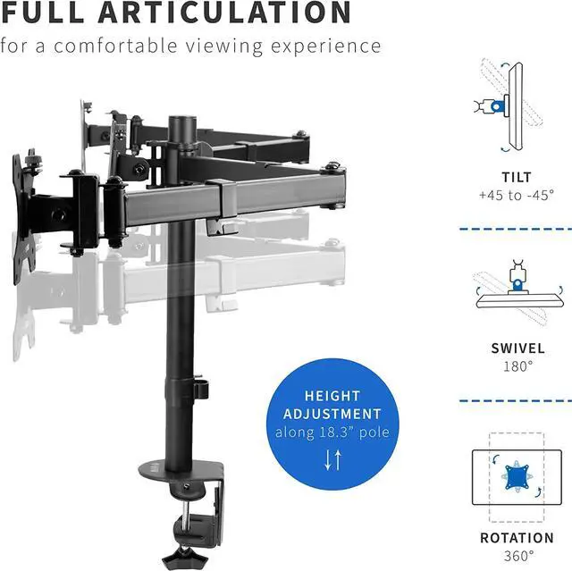 Finding the ideal viewing angle and experience is easy with 15 points of articulation. The fluidity allows your monitors to tilt 45 degrees in either direction, swivel 180 degrees, and rotate a full 360 degrees.