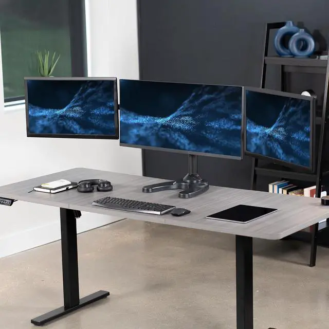 STAND-V103F Clear up valuable desk space and view three monitors side-by-side with this Freestanding Triple Monitor Mount. Made with high-grade steel that provides excellent triple monitor support, security, and scratch resistance, this stand supports monitors 23 to 32 in size and 22 lbs in weight. Designed with user-geared features such as smooth arm articulation, removable VESA mounting plates, adjustable monitor height, integrated cable management, and more to meet your particular office needs.