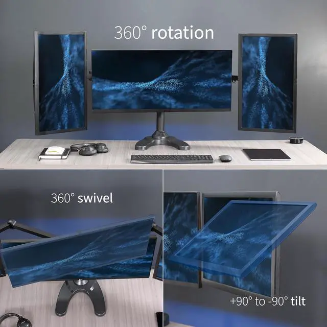 1ADJUSTABLE2SOLID SUPPORT3ORGANIZED Screen Size:3 Monitor Screens 23" to 32"Weight Capacity:22 lbs per screenVESA Compatibility:75x75mm, 100x100mmTilt:+90 to -90 degreesSwivel:360 degreesRotation:360 degreesHeight Adjustable:Along 17.5" Center PoleBase Dimensions:12.5 x 13.5 Arm Span:67.2" Free-Standing Triple Monitor Mount COMFORTABLE VIEWING FOR ANY PROJECT Articulation Sturdy Base Cable Management SPECIFICATIONS