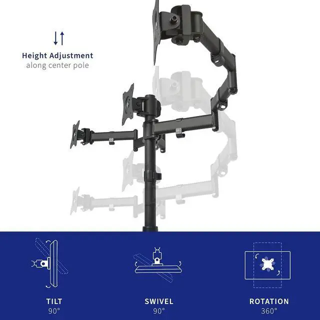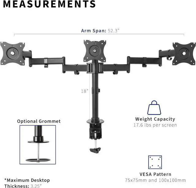 Triple monitor mount (STAND-V003M) from VIVO. Clear up valuable workspace on your desk with this heavy duty three monitor stand. Constructed of high-grade steel, this mount was built to resist scratches and supports three LCD screens up to 17.6 pounds and 24 in size each (this mount will fit 27" screens but will only allow very limited angled screen positioning). Tighten or loosen each joint to make your stand as fluid or stationary as desired. Monitors can be rotated to landscape and portrait positions. More features built into STAND-V003M include an integrated cable management system to hide power and video cables. The newly designed VESA plates allow each individual plate to be adjusted up and down by 1.1 so your monitors will be perfectly aligned.