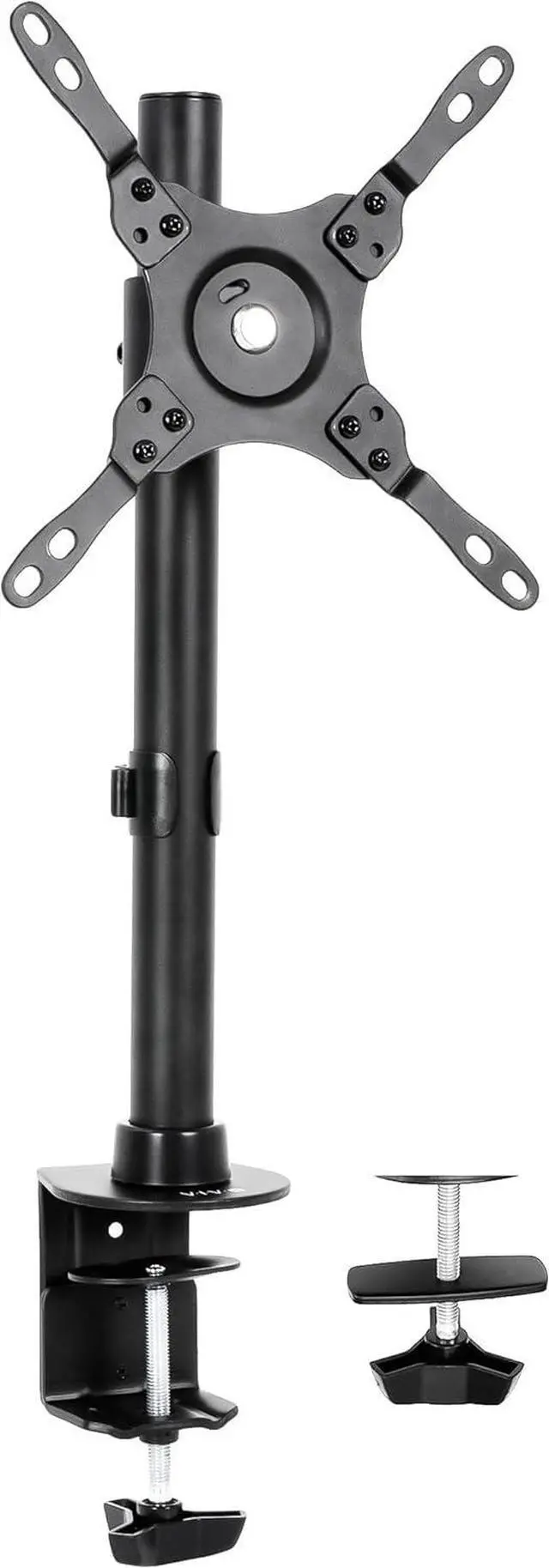1HEAVY DUTY C-CLAMP2CABLE CLIPS3SOLID SUPPORTMaterial Steel, AluminumPole Height 17.5 Articulation +45° to -45° tilt, 90° swivel, and 360° rotationHeight Adjustment Provided along the center poleMounting Options C-Clamp or GrommetScreen Orientation Portrait or LandscapeFits Ultrawide Monitors, Regular Monitors, and TV's up to 42"VESA Patterns 75x75mm, 100x100mm, 200x100mm, 200x200mmWeight Capacity 22 lbs High capacity mount provides a solid hold for monitors & TVs up to 42" SUPPORT FOR LARGE DISPLAYS Easy Ergonomic Positioning Small Desktop Footprint Cable Management Clip Durable Strength Specifications & Compatibility