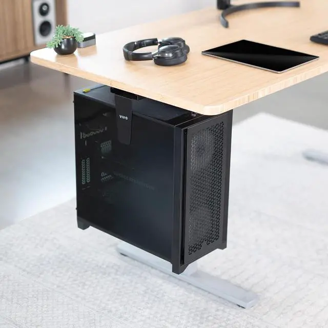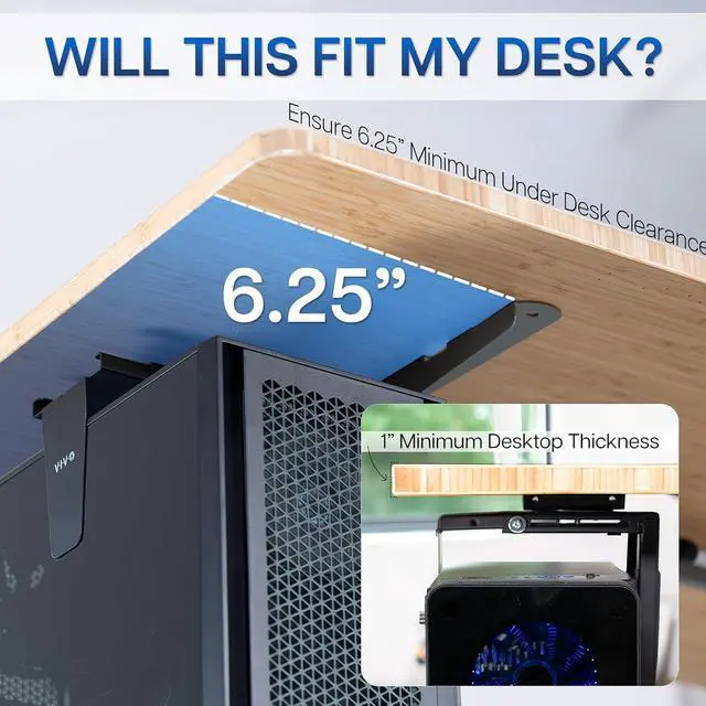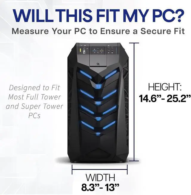 Adjustable Frame: Fits most PC cases on the market with adjustable width from 8.3 to 13 and adjustable height from 14.6 to 25.2. Desktop should have an overhang (distance from desk frame supports to the outer edge of desk) greater or equal to the width of your PC
