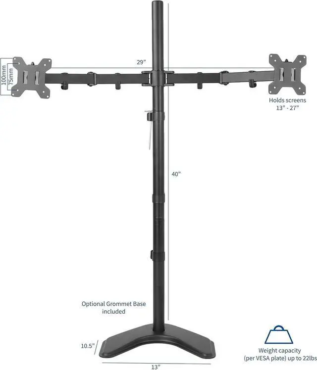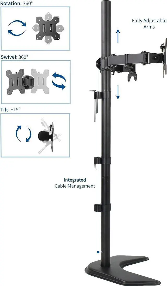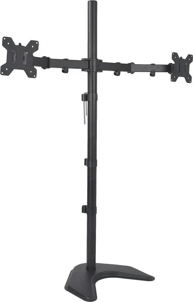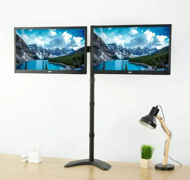 Complete your office space with a dual free-standing monitor mount from VIVO. Clear up workspace on your desk and enjoy the benefits of standing while working with this extra tall monitor stand. The 40" center pole and adjustable computer screen height allow the user to adjust to either a sitting or standing position. High-grade steel and aluminum along with a heavy-duty base ensure your monitors will be kept secure. Mounting brackets are VESA compatible and support the majority of monitors on the market.