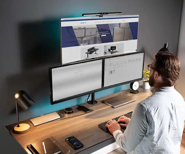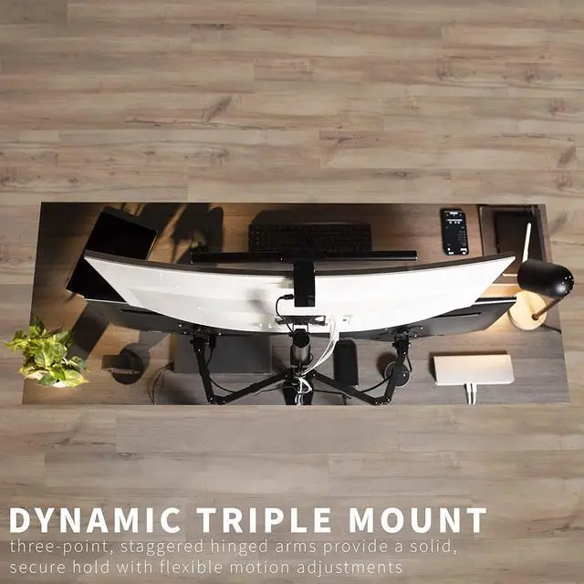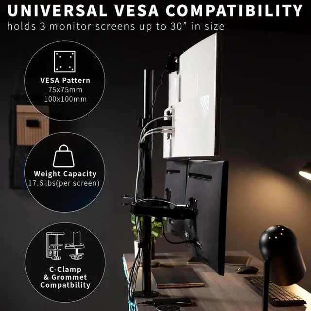 The triple monitor experience is great for the office multitasker or home gamer. Elevate your screens to a more comfortable and ergonomic viewing position. With this stand's long monitor arms and fluid articulation, finding the optimal angle for each display is easy. High-grade steel and aluminum along with a heavy-duty C-clamp or optional grommet ensure your monitor will be kept secure. Mounting brackets are VESA compatible and support the majority of monitors on the market.