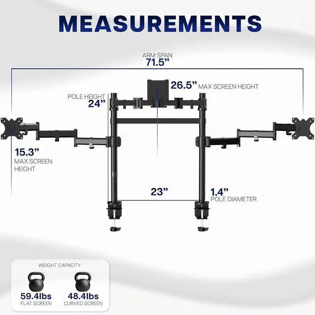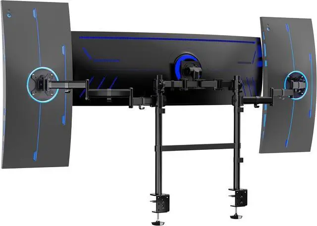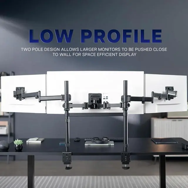 Low-Profile Dual-Pole Design Upgrade your workspace with this triple monitor desk mount, designed to hold one center ultrawide and two side screens for the ultimate panoramic setup. The dual-pole design keeps your displays low-profile and close to the wall while freeing valuable desk space. Featuring flexible tilt, swivel, and rotation adjustments, durable steel construction, and heavy-duty C-clamps, this mount provides stability, comfort, and sleek organization for any multi-screen workstation.