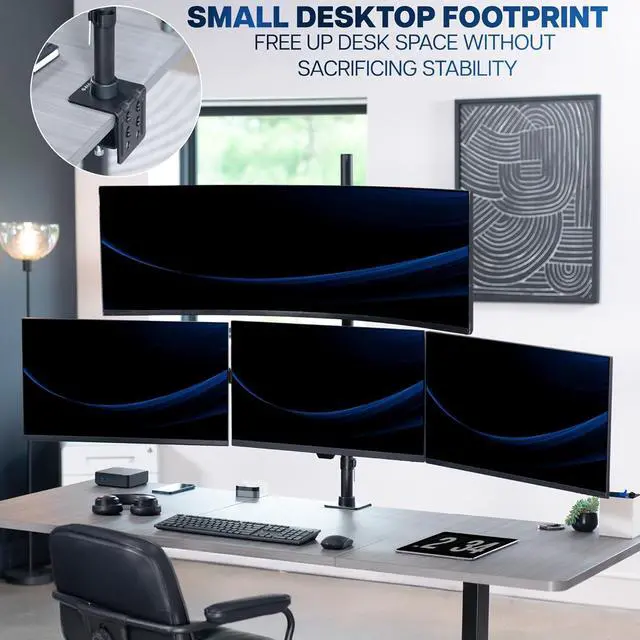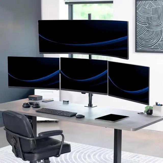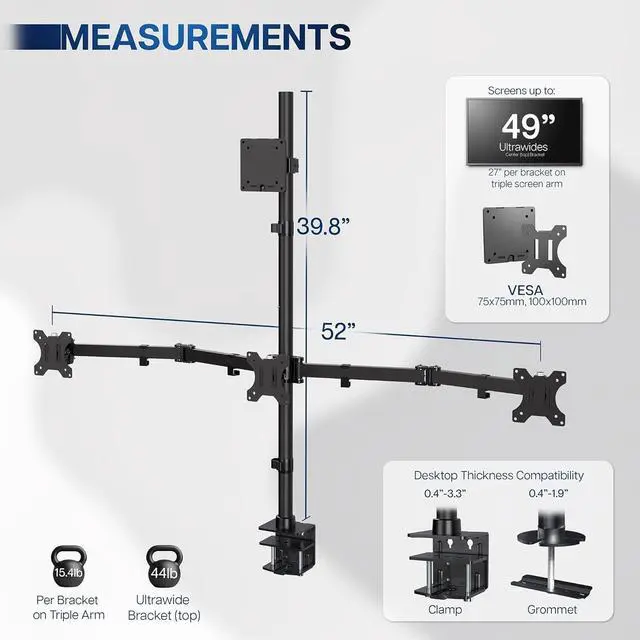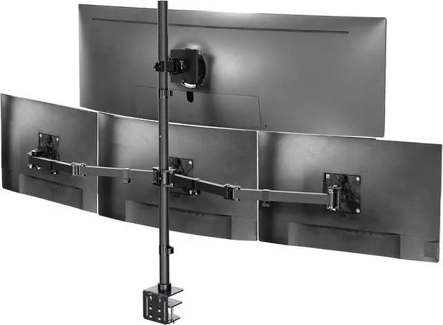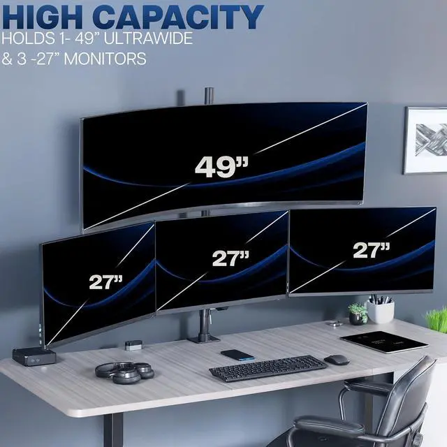 Quad Monitor Desk Mount: Fits 1 ultra-wide (up to 49) on top bracket and 3 standard screens (up to 27) on lower arm brackets with VESA 75x75mm or 100x100mm mounting holes. Holds up to 44 lbs on top bracket and 15.4 lbs per lower bracket