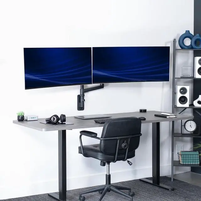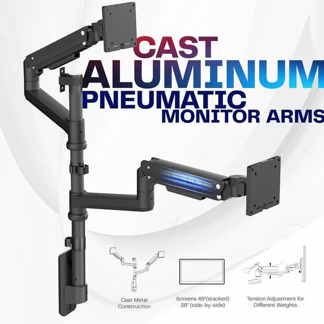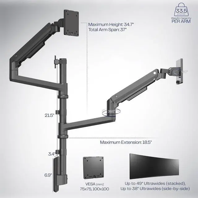 Supports 2 large screens for maximum work efficiency Display 2 large screens on one stand Set it & Forget it Heavy-Duty Cast Aluminum Construction Integrated Cable Management Mounting Options EASY ARTICULATON for FLEXIBLE SETUPS Please Check Compatibility Compatibility & Specs