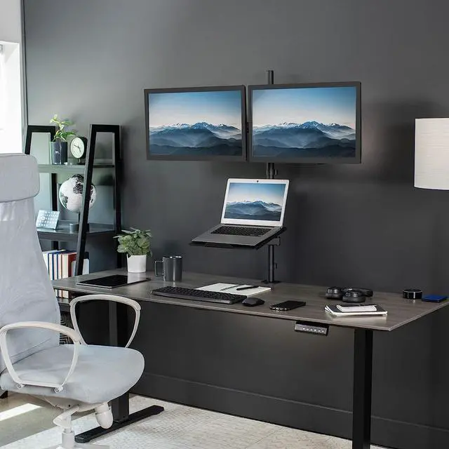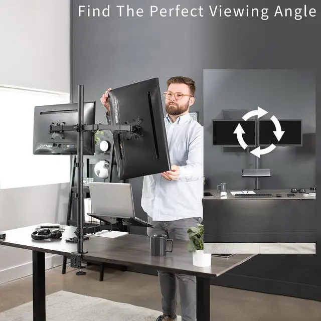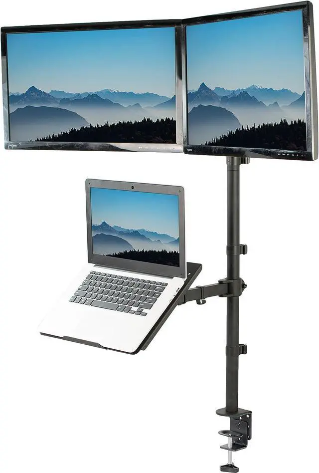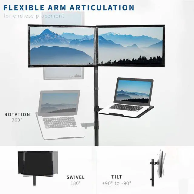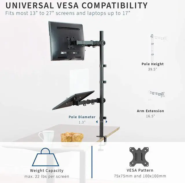1Full Articulation2Laptop Mount3Solid Support Screen Sizes13 to 27, laptops up to 17"Compatible Desktop Thickness 0.4 to 3.25 (C-Clamp), 0.4 to 3 (Grommet) VESA Standard75x75mm and 100x100mmWeight Capacity22 lbs per monitor, 11 lbs for laptop trayArm Span29"Laptop Tray Dimensions14 x 11.8 Pole Height 39.5 (STAND-V012L), 26 (STAND-V012J)Screen Extension 16.3 (from the pole) Laptop Tray Extension21 (with tray horizontal) Height AdjustmentProvided along the center poleScreen OrientationPortrait or Landscape Elevate Your Workspace Extra Tall Monitor + Laptop Mount Full Articulation Ventilated Laptop Tray Heavy Duty Support Product