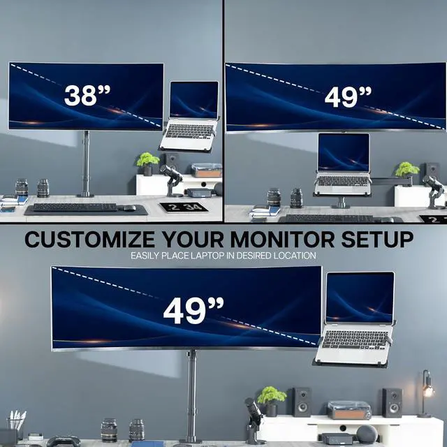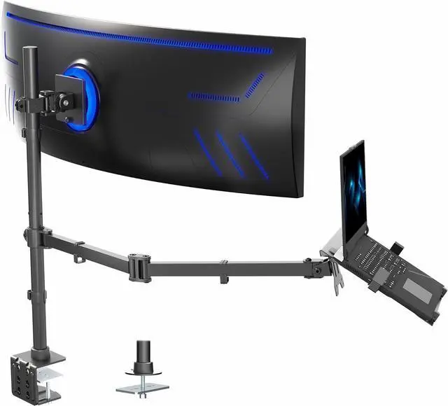 Tall Pole Elevate your ultrawide monitor and laptop on a single space-saving stand that boosts ergonomics and workflow. Designed for screens up to 49 and laptops 10 to 15.6, this dual-platform mount provides smooth articulation, ventilated laptop support, and secure C-clamp or grommet attachment. Durable aluminum and steel construction ensures a stable, efficient setup with adjustable height and versatile viewing angles.