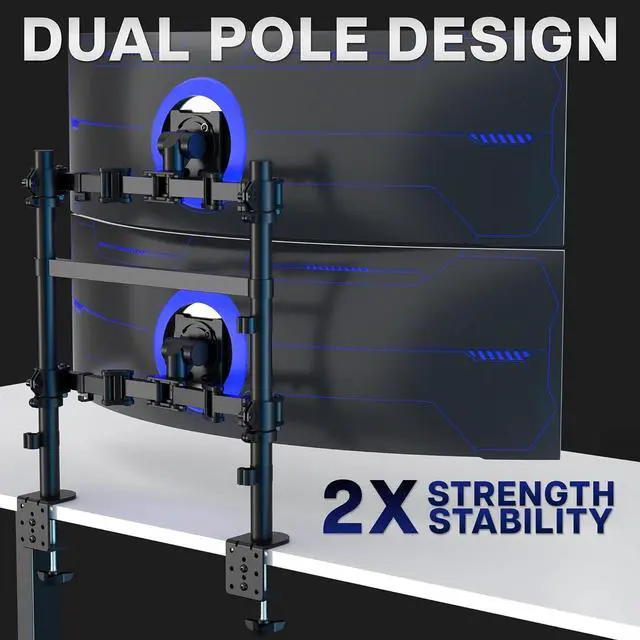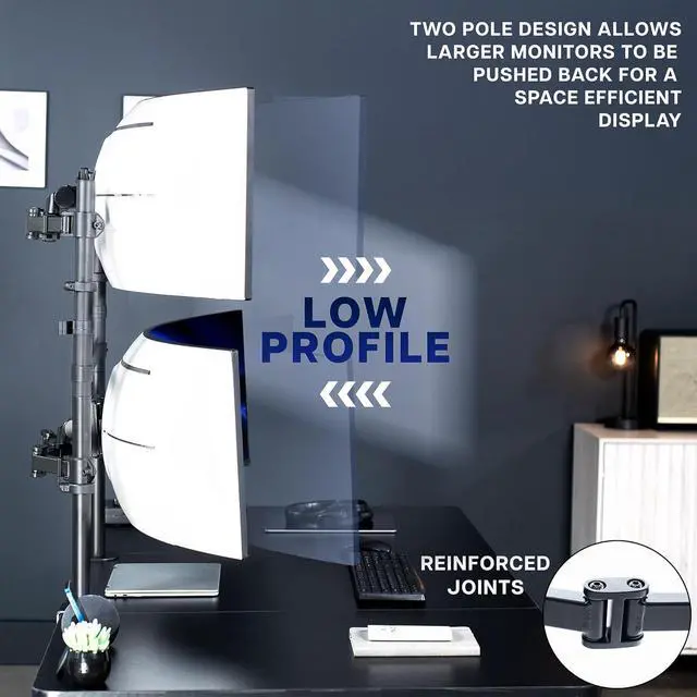 Low-Profile Dual-Pole Design Create a clean, vertical workspace with this dual-pole monitor mount designed to hold two screens stacked in perfect alignment. The sturdy dual-pole frame provides exceptional stability for heavy monitors while maintaining a low-profile footprint. Enjoy ergonomic viewing with adjustable tilt, swivel, and rotation, plus solid steel construction, smooth height adjustment, and built-in cable management for a stable, organized, and professional setup.