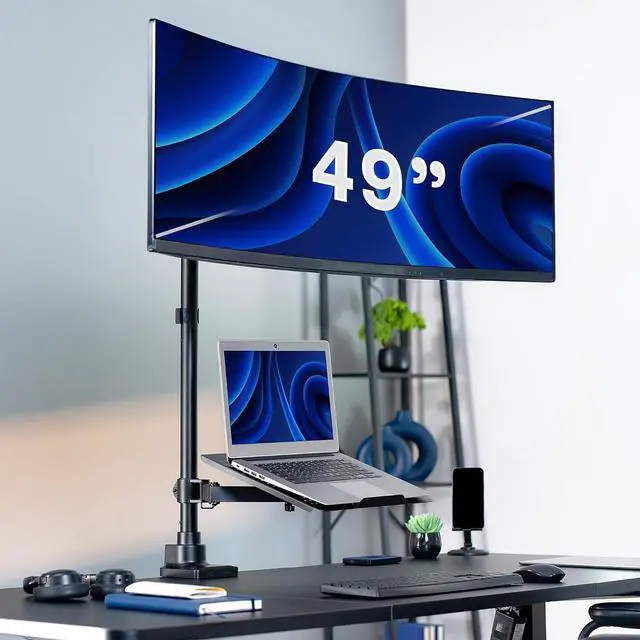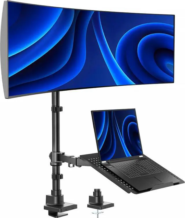 Create a powerful dual-screen workspace with this extra-tall ultrawide monitor and laptop mount. Featuring sturdy steel and aluminum construction, it offers full height, tilt, and swivel adjustability for ergonomic viewing. Save desk space and enjoy a clean, organized setup.