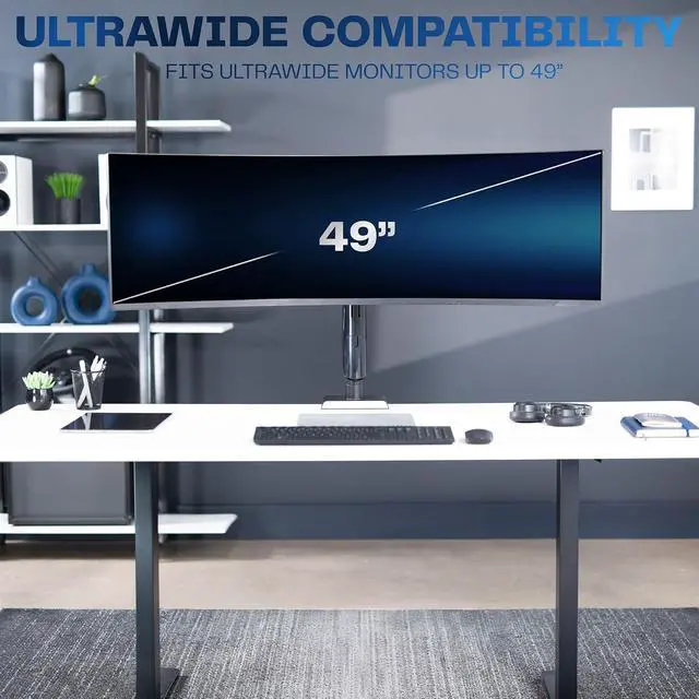 1STURDY DESIGN2FLEXIBLE VIEWING3ORGANIZED4SAVE SPACE5EASY INSTALLATION Vertical Lift Single Ultrawide Monitor Desk Mount Vertical Height Adjustment Premium Aluminum and Steel Design Mounting Bracket features Tilt & Rotation Save Valuable Work Space Heavy Duty Clamp