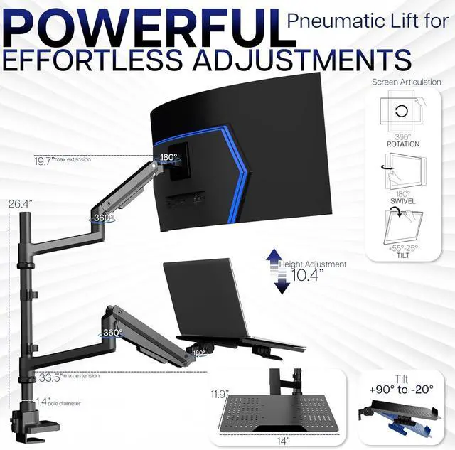 Transform your desk with this extra-tall mount for ultrawide monitors and laptops. Pneumatic arms provide effortless height and angle adjustments, while heavy-duty steel and aluminum construction ensures stability. Save space, boost ergonomics, and enjoy a customizable setup.