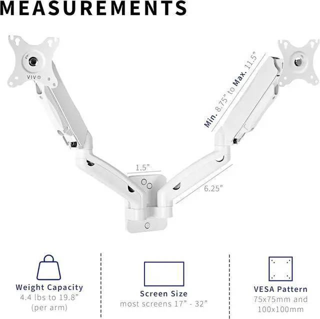 Compatibility - Fits two computer monitors 17" to 27" (2.0kg to 9.0kg each) with VESA 75x75mm or 100x100mm mounting holes.