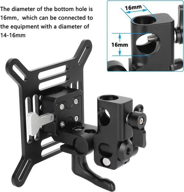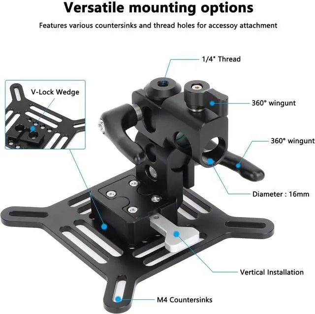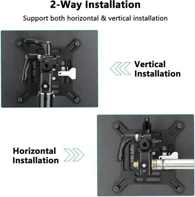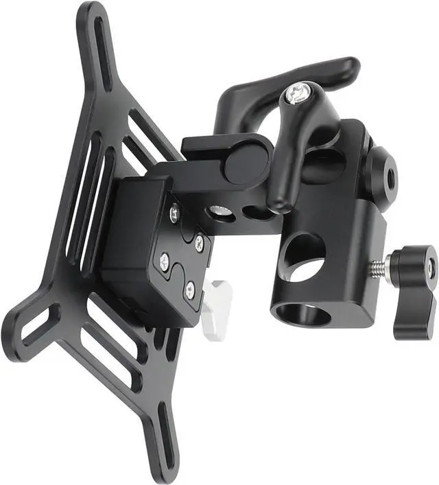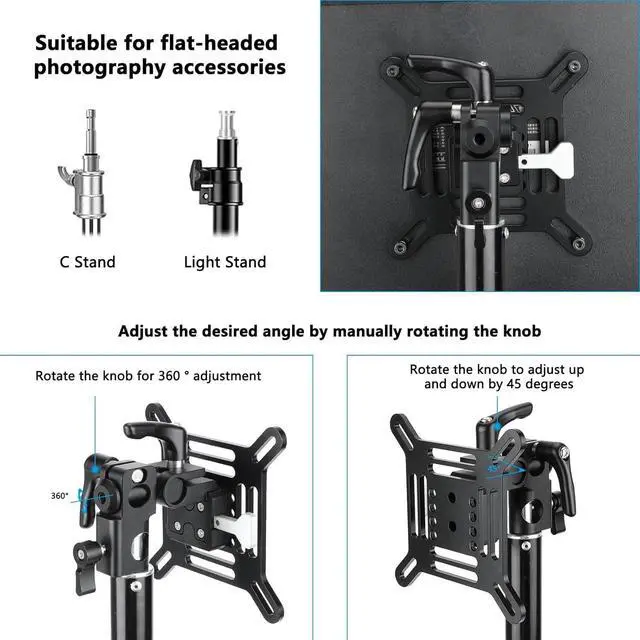 Aluminum Alloy Construction Quick Release V-Lock System Supports Monitors/TVs up to 22 lb 360°Rotation Pan, 45°Down/Up Tilt 75 x 75 & 100 x 100mm VESA Patterns 5/8"(16mm) Light Stand Mount Receiver