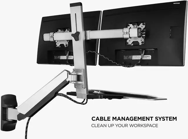 Use this Adjustable Sit-Stand Wall Mount for your computer monitors and keyboards, mouse, notebooks and pens, laptops, and other necessities that you use at work. For your convenience, it includes a large keyboard tray and a durable mount.