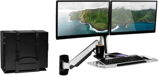 Mount-It! Sit Stand Wall Mount Workstation & Stand Up Computer Station With Dual Monitor Mount Articulating Keyboard Tray Arm and CPU Holder