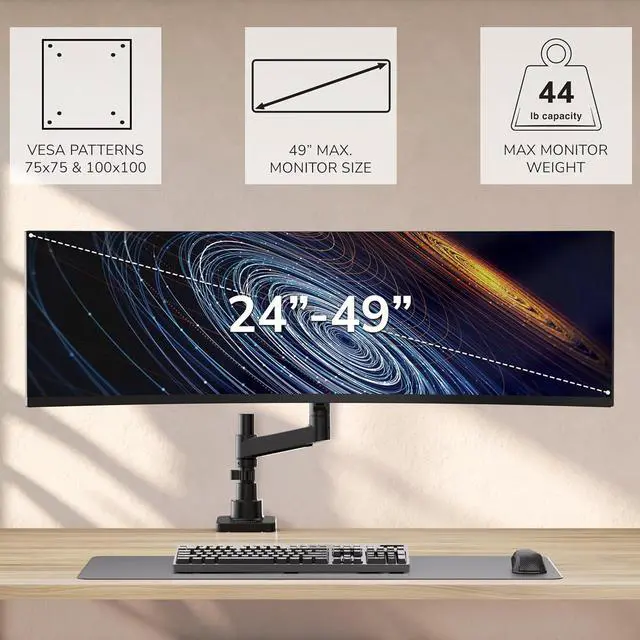 Built strong for ultrawide monitors Heavy-duty steel and aluminum construction supports up to 44 lbs with reinforced joints for stability, perfect for wide curved displays like the 49 class.