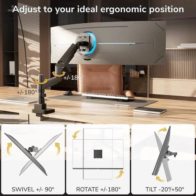 Smooth, precise movement Gas spring arm provides effortless tilt (+50°/20°), swivel (180°), rotation (180°), and extension, allowing you to fine-tune angles for long work sessions, creative tasks, or gaming.
