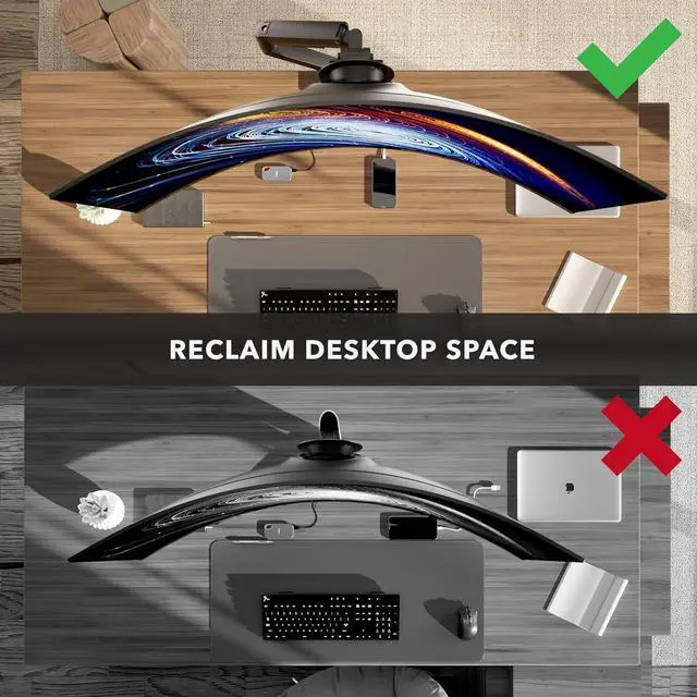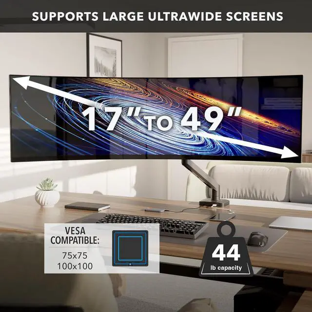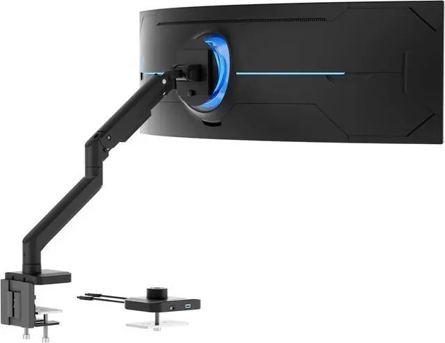 Full Motion Adjustability for Perfect Viewing Achieve ergonomic comfort with tilt (+50°/-20°), swivel (+/-90°), 360° rotation, and gas spring-assisted height adjustment. Customize your 49 inch monitor arm setup for gaming, work, or multitasking with ease.